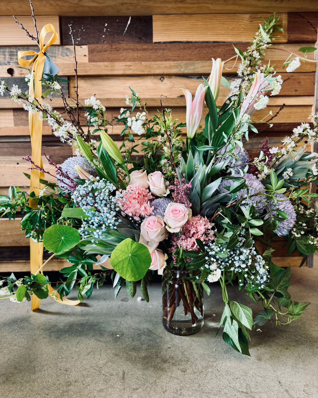 our feminine florals capture nature’s softer side with a palette of delicate, romantic hues. Each piece is designed sustainably with minimal plastic and floral foam, featuring recycled glass jars and/or paper wraps. Please note, seasonal availability brings unique variations to each arrangement, ensuring a one-of-a-kind creation every time.
