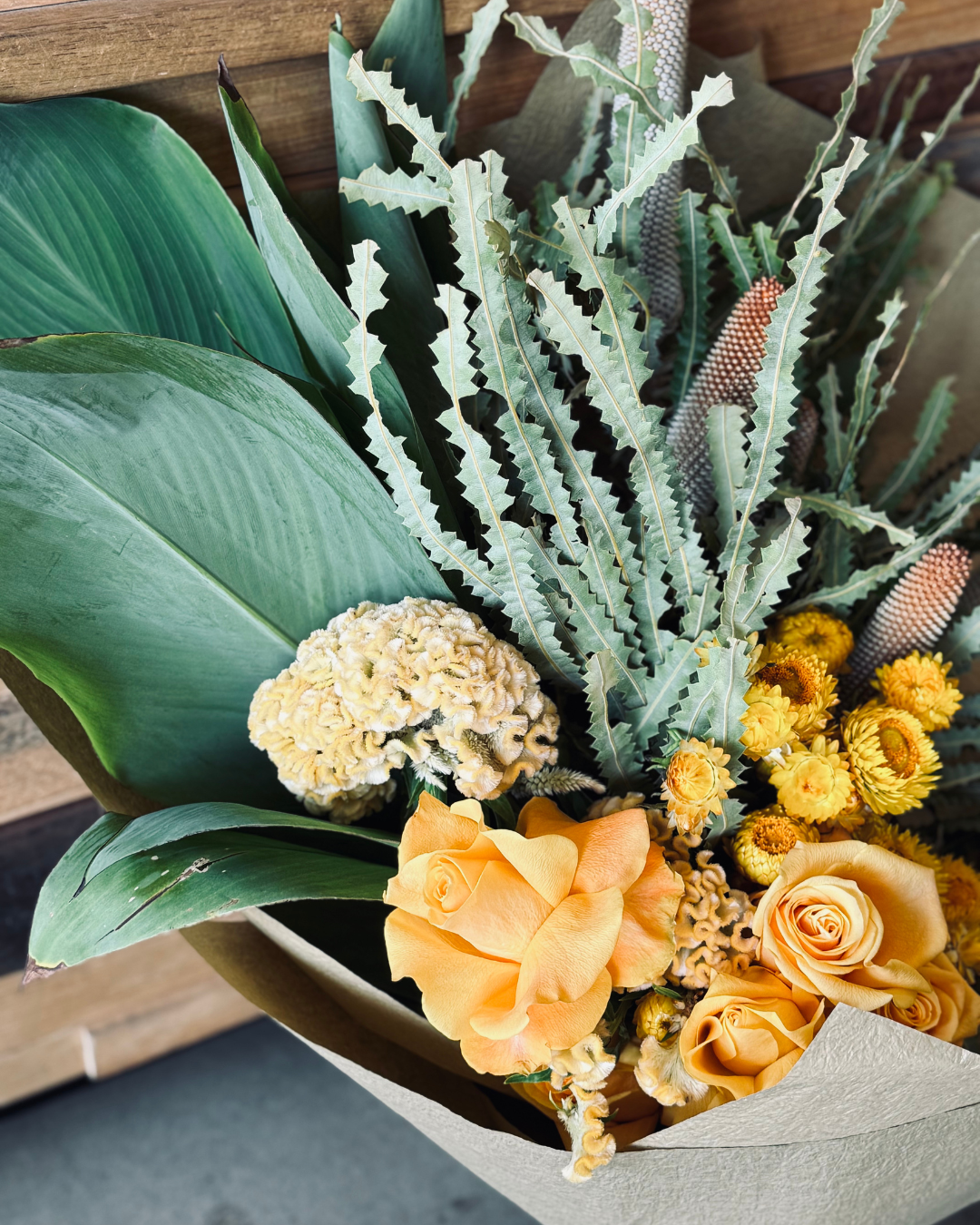 discover refined strength with our Masculine Florals – a bold mix of rich hues and earthy textures. Perfect for a modern, impactful arrangement, each piece is designed sustainably with minimal plastic and floral foam, featuring recycled glass jars and/or paper wraps. Every arrangement is uniquely crafted for a lasting impression.