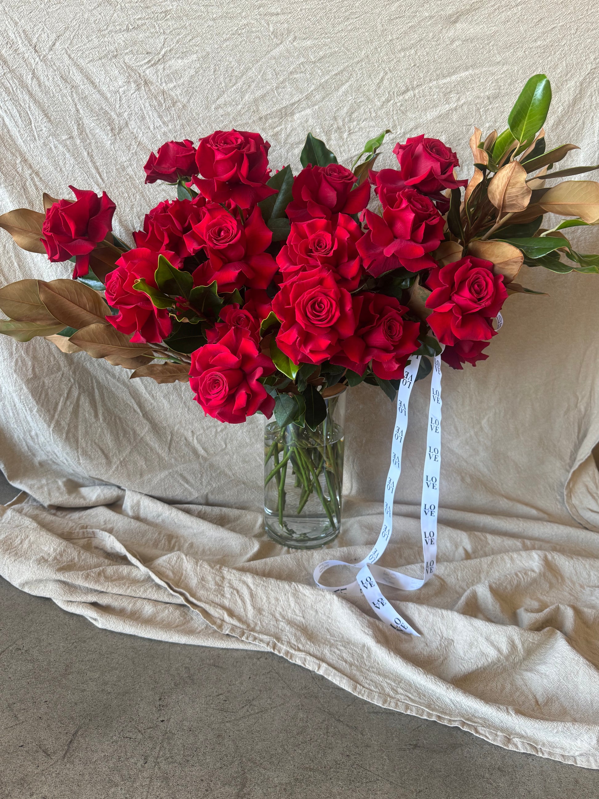 The Classic features premium red roses arranged with lush foliage and finished in our signature white wrap and flowing ribbons. A traditional expression of love - generous, elegant and designed to make an impact.